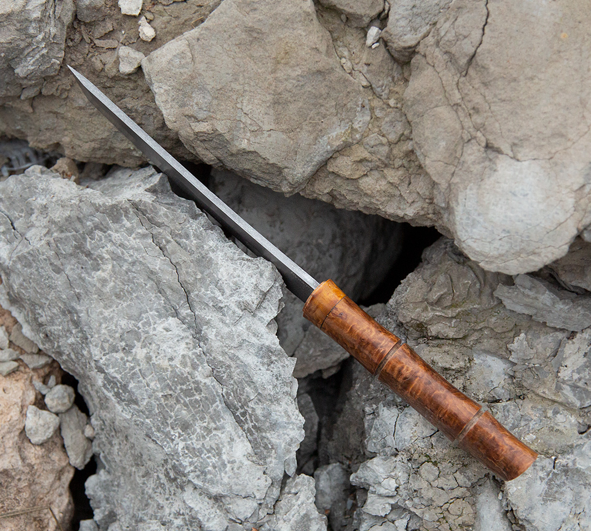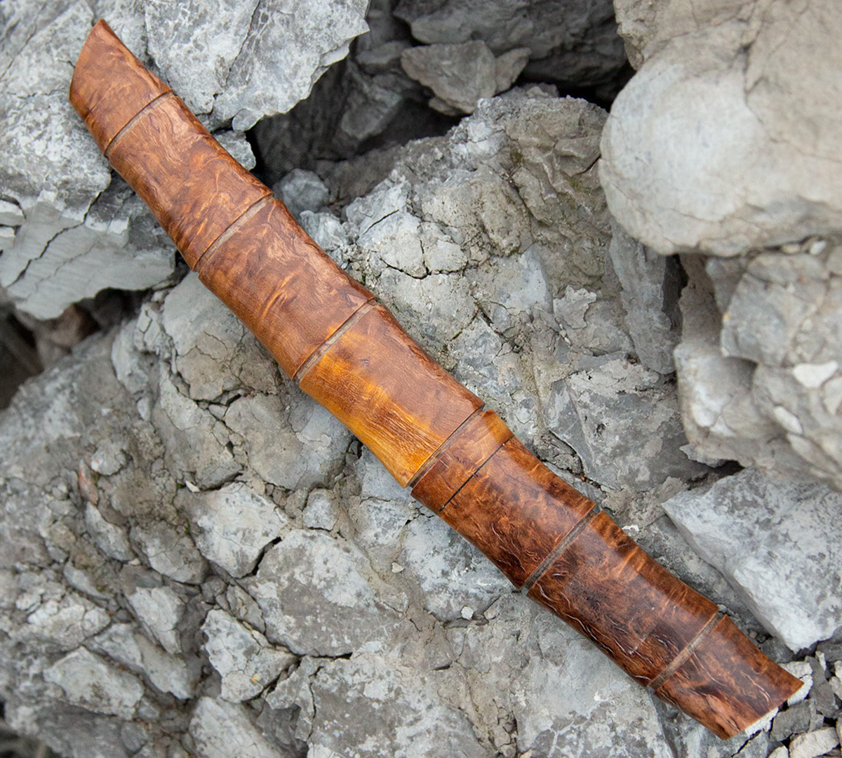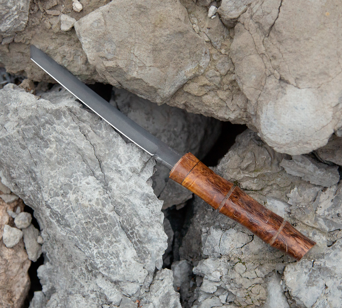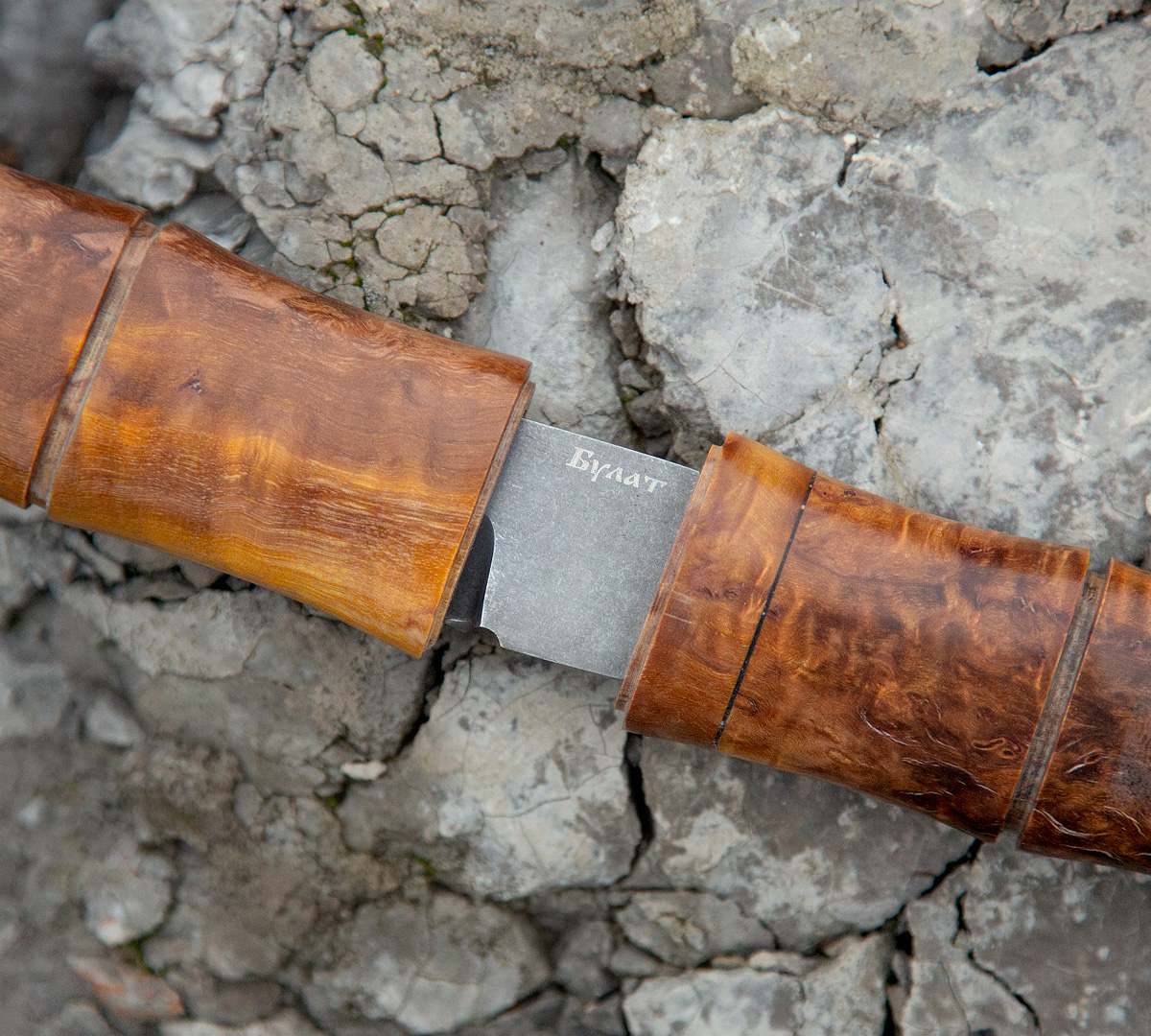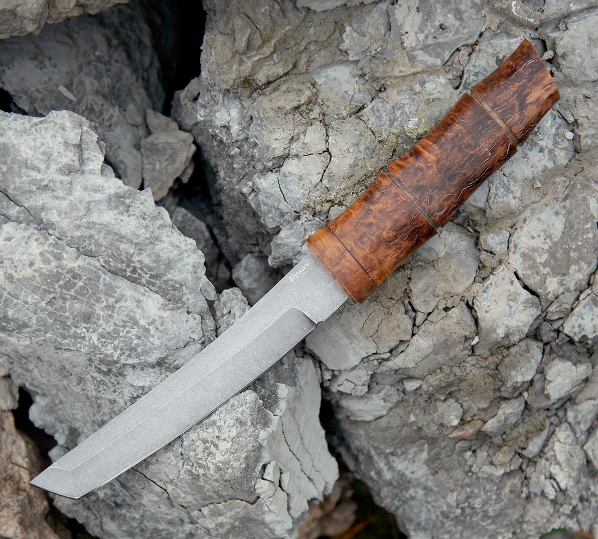 Нож Танто из булатной стали в деревянных ножнах, рукоять и ножны - стабилизированная карельская береза.