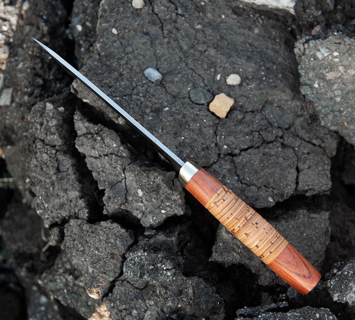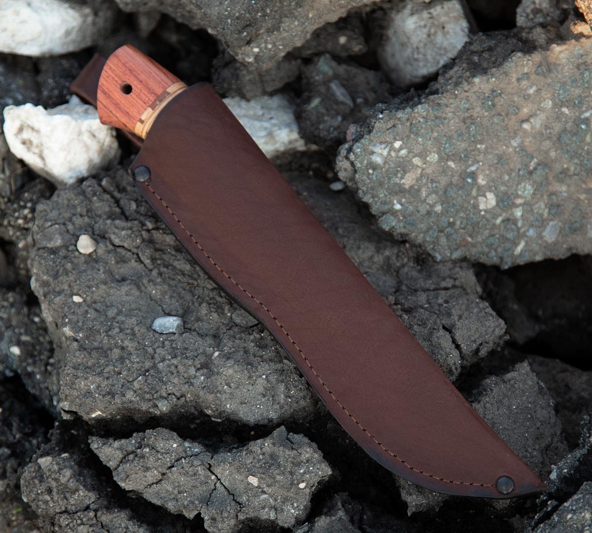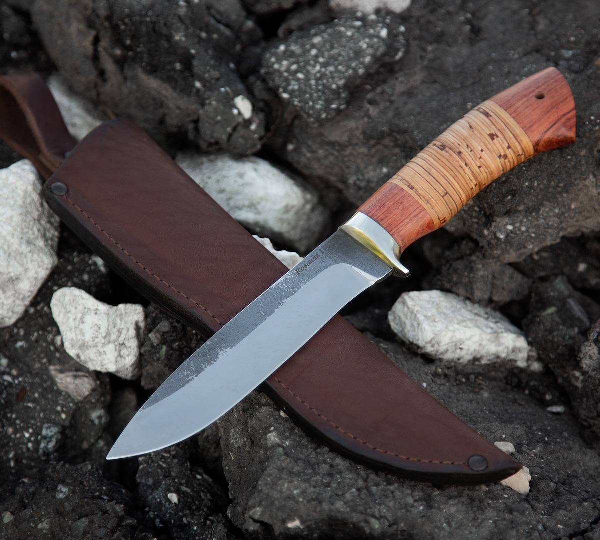 Нож Олимп из кованной нержавеющей стали 110Х18, рукоять - бубинга + береста, кожаный чехол идет в комплекте.
