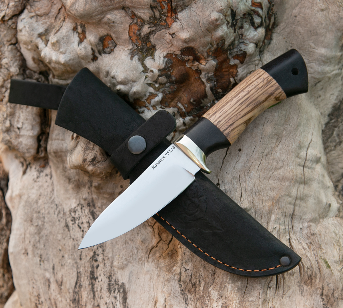 Нож Лань из кованой нержавеющей стали 95Х18, рукоять - зебрано + венге, кожаный чехол в комплекте.