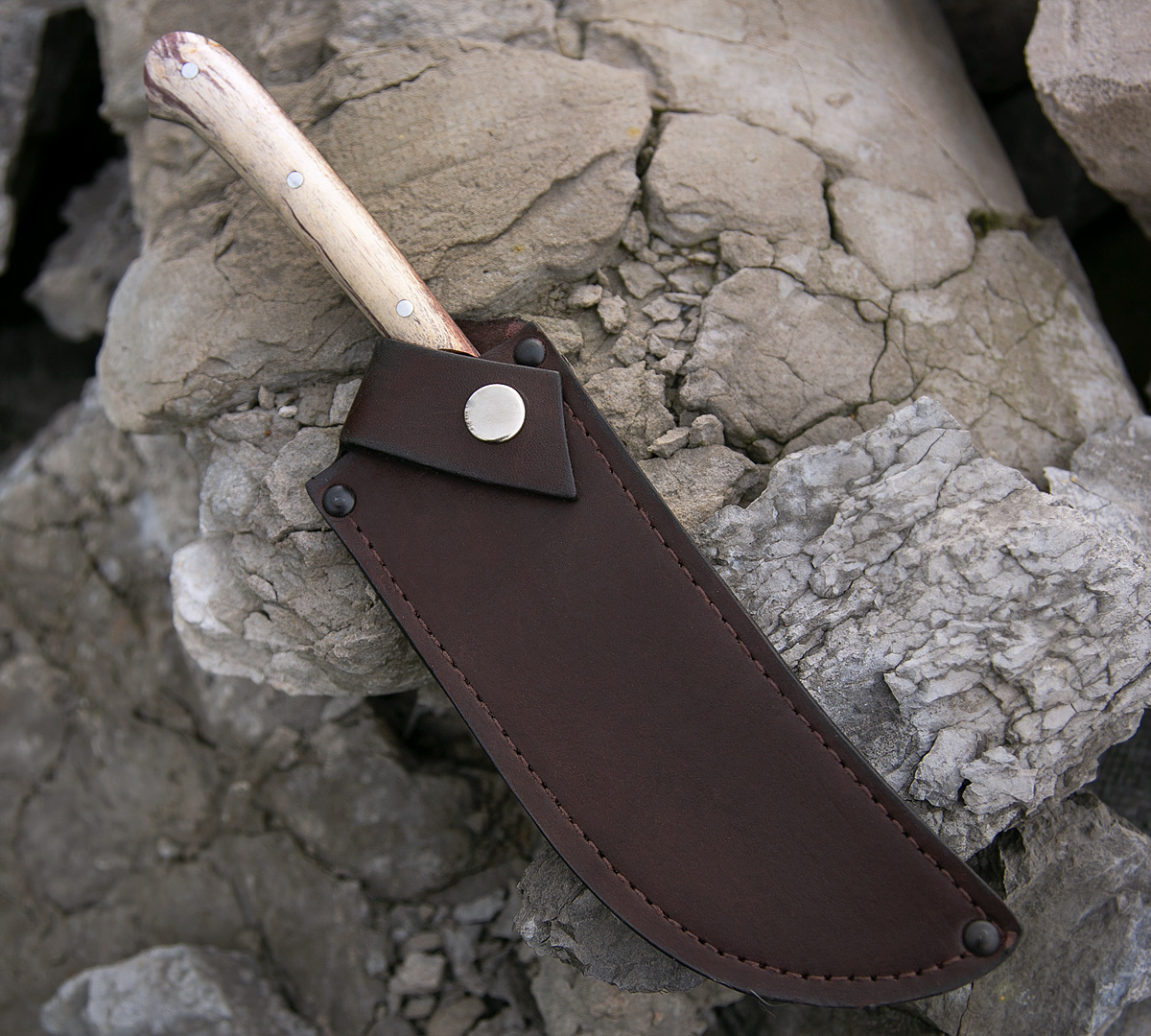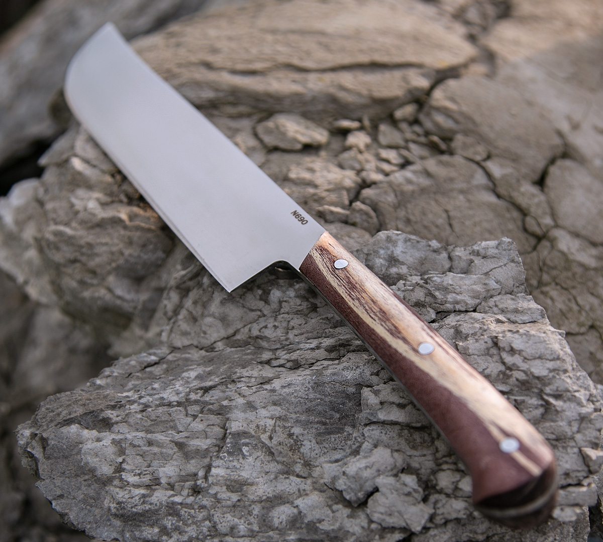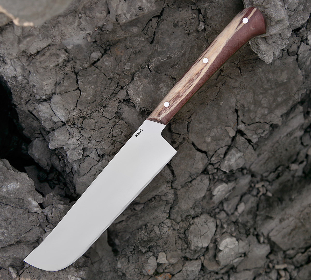 Нож Пчак из нержавеющей стали N690, рукоять - стабилизированная карельская береза, кожаный чехол идет в комплекте.